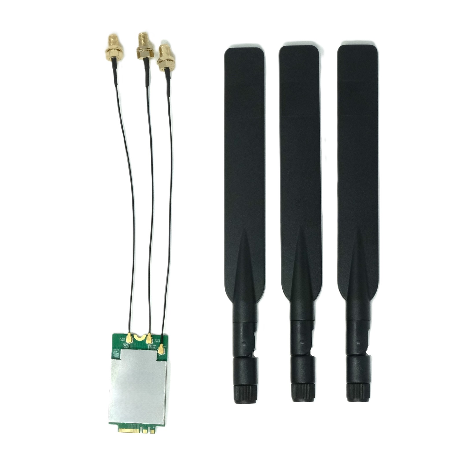 The kit includes 3x internal micro coax cables (IPEX) and 3x tri-band WiFi antennas.